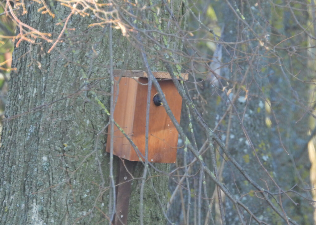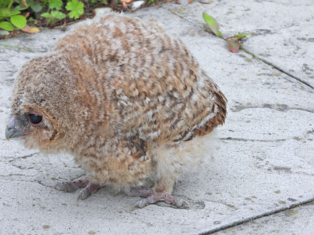 Šventoriaus medžiuose peri kelios naminės pelėdos. Pernai iš lizdo iškrito jauniklis.